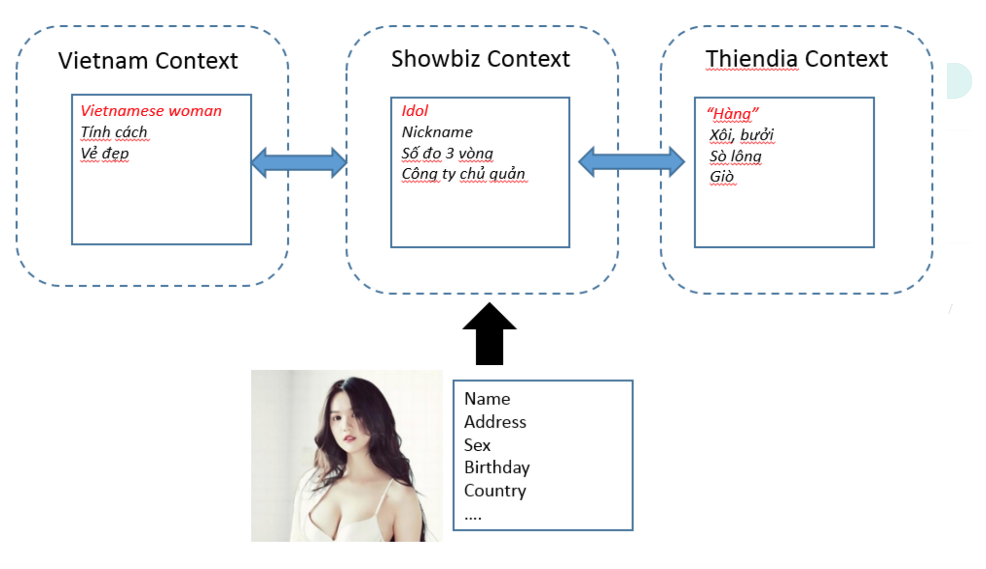 Ở ngữ cảnh Việt Nam, Domain Entity Ngọc Trinh trở thành người Vietnamese woman có tính cách trung hậu đảm đang, có vẻ đẹp thùy mị đoan trang. Tóm lại công, dung ngôn, hạnh đủ cả.