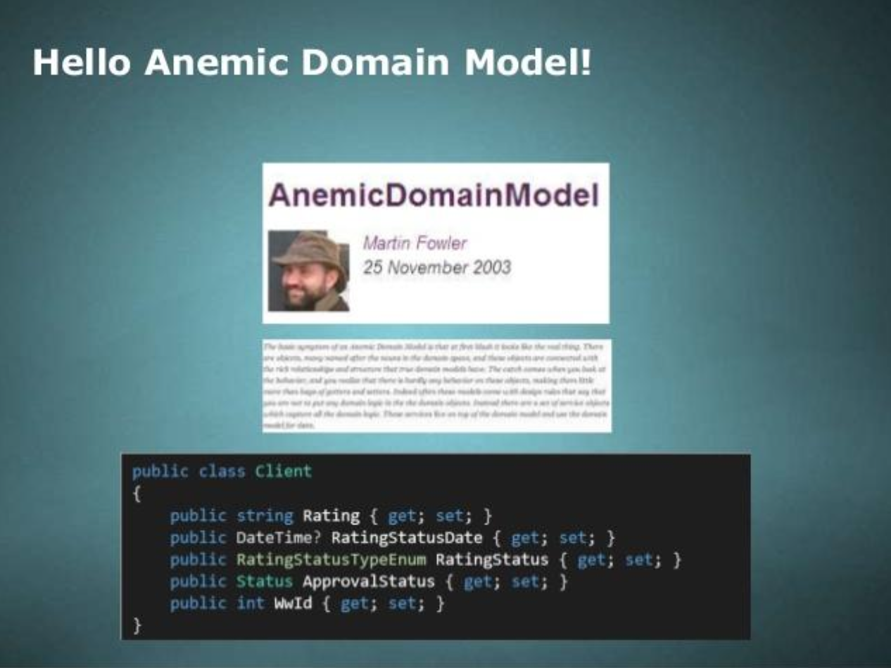 The basic symptom of an Anemic Domain Model is that at first blush it looks like the real thing. There are objects, many named after the nouns in the domain space, and these objects are connected with the rich relationships and structure that true domain models have. The catch comes when you look at the behavior, and you realize that there is hardly any behavior on these objects, making them little more than bags of getters and setters
