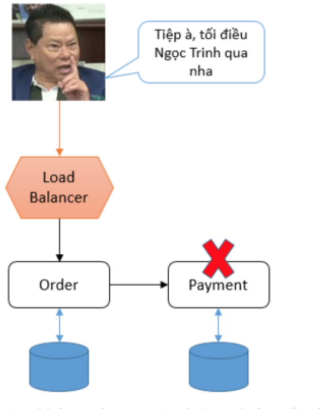 Mọi thứ sẽ hoạt động bình thường nếu như các service không có trục trặc gì. Tuy nhiên đối với hệ thống phân tán như Microservice, việc các service gặp vấn đề là điều ko tránh khỏi. Điều gì xảy ra nếu như service Payment bị lỗi? Điều này dẫn tới hệ thống sẽ có 1 Order nhưng không có Payment tương ứng. Anh Kiều được chén e Ngọc Trinh miễn phí, ăn bánh không phải trả tiền. Như vậy data trong hệ thống sẽ không nhất quán (Inconsistency).