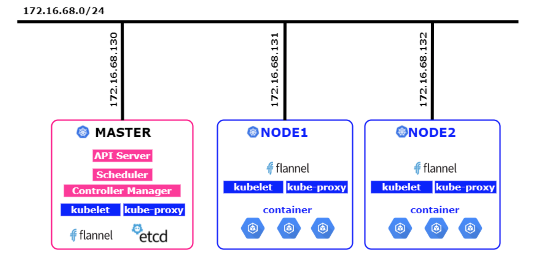 k8s-node1cat << EOF > /etc/hosts 127.0.0.1 localhost k8s-node1 172.16.68.130 k8s-master 172.16.68.131 k8s-node1 172.16.68.132 k8s-node2 EOFecho k8s-node1 > /etc/hostname