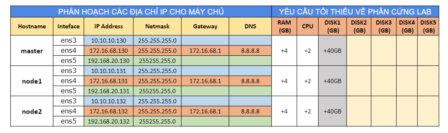 - Lưu ý: Mặc dù trong bảng trên ta có 03 NICs cho mỗi máy nhưng trong các bước hướng dẫn này ta chỉ cần sử dụng interface có dải