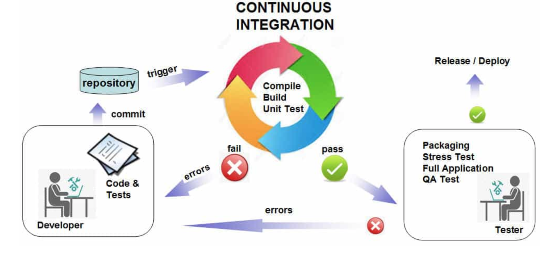 Giờ nếu như thằng Dev nó commit code lên repository như GitHub hoặc make Pull Request, hệ thống CI sẽ tự động detect new source và pull source về để thực hiện build, chạy test (Unit Test, Smoke Test), ngoài ra còn có thể tích hợp 1 số công cụ review code như Coverity hoặc Sonar nữa để generate kết quả review code trước khi chạy test. Nếu như kết quả Test Pass, quá trình deploy sẽ đc trigger và app sẽ được deploy lên server trên các môi trường khác nhau (QA, DEV, Staging và Production environment). Server có thể là on premise hoặc cloud (AWS, GCE). Ngược lại có lỗi thì không deploy, notify lại cho developer qua mail hoặc kênh chat như Slack… Quá trình CI này được thực hiện bởi các pipeline job. Thực chất là 1 cấu hình build cho 1 ứng dụng. Vòng đời quản lý của 1 ứng dụng có thể có 1 hoặc nhiều job/item, được viết dưới dạng script (Groovy Script hoặc Shell). Các script này sẽ thực hiện các tác vụ tự động như run command build, execute tests script, output kết quả ra console. Tóm lại thay vì anh DevOps deploy app manual thì sẽ automated nó bằng scripting, vừa đơn giản gọn nhẹ lại ít sai sót. Tool để làm CI rất nhiều, chẳng hạn như